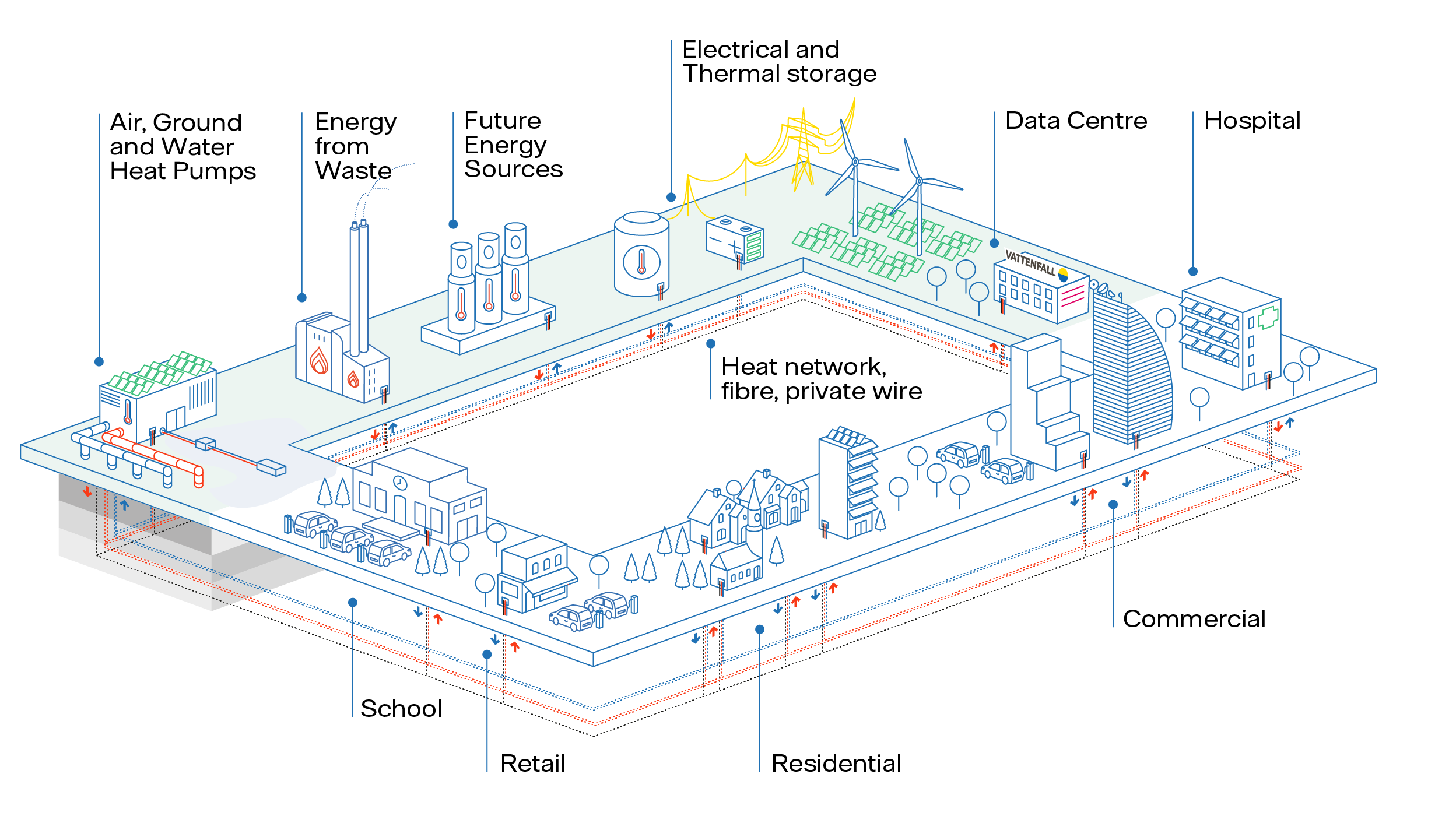 Heat networks offer significant efficiency advantages, especially when using waste heat sources like energy-from-waste (EfW) plants or data centres. For instance, Vattenfall’s MEL Energy Centre in Midlothian will supply low-carbon heat to over 3,500 homes by utilising waste heat from an EfW plant. - Architectural benefits